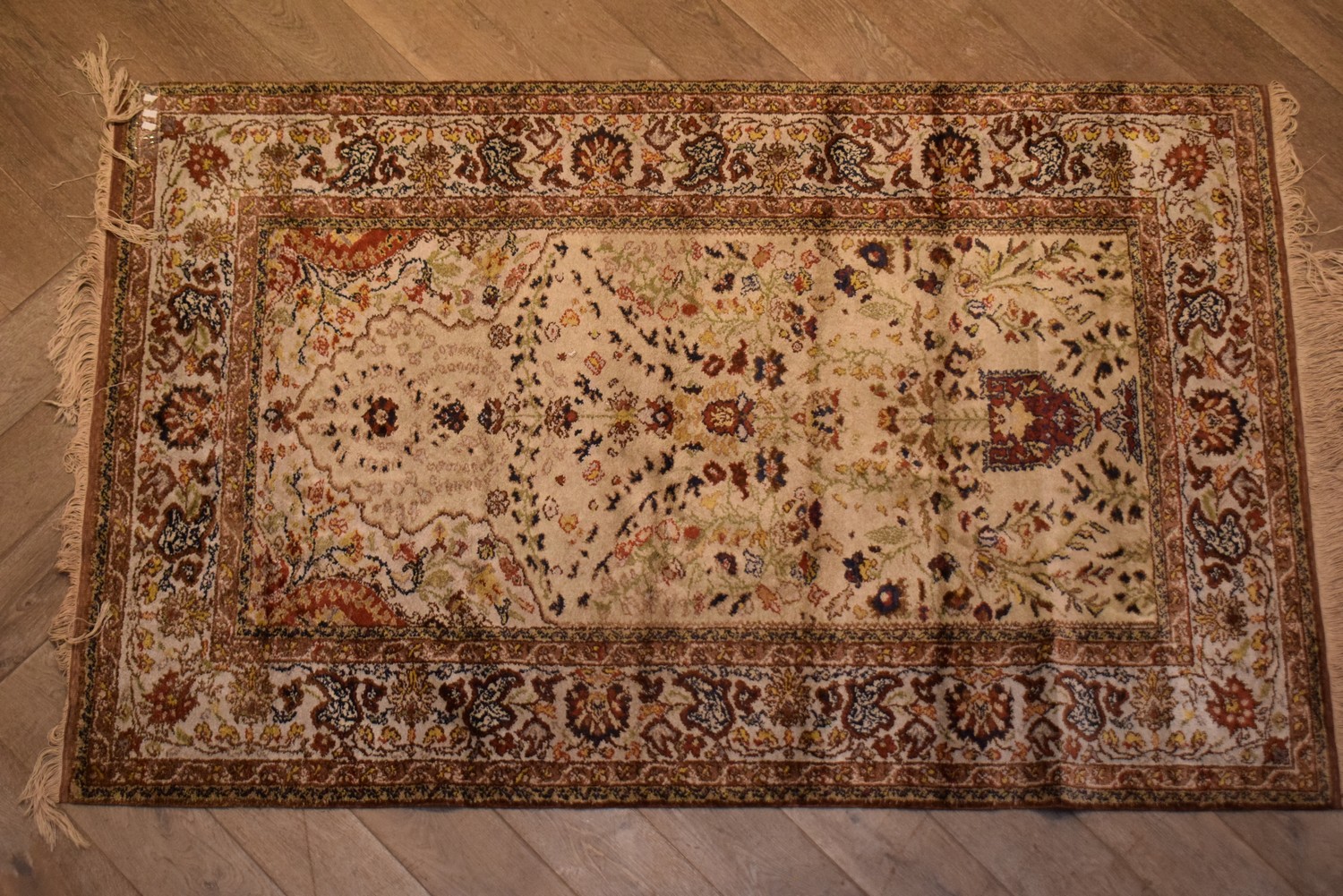 A SILK ON COTTON PERSIAN RUG IN TONES OF CREAM WITH TRADITIONAL MOTIFS (190L x 120W CM)