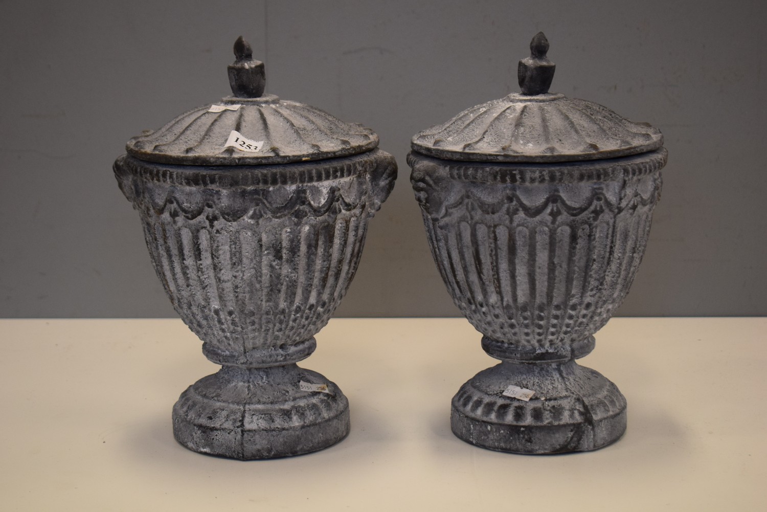 A PAIR OF CAST IRON LIDDED URNS (30 CM H)