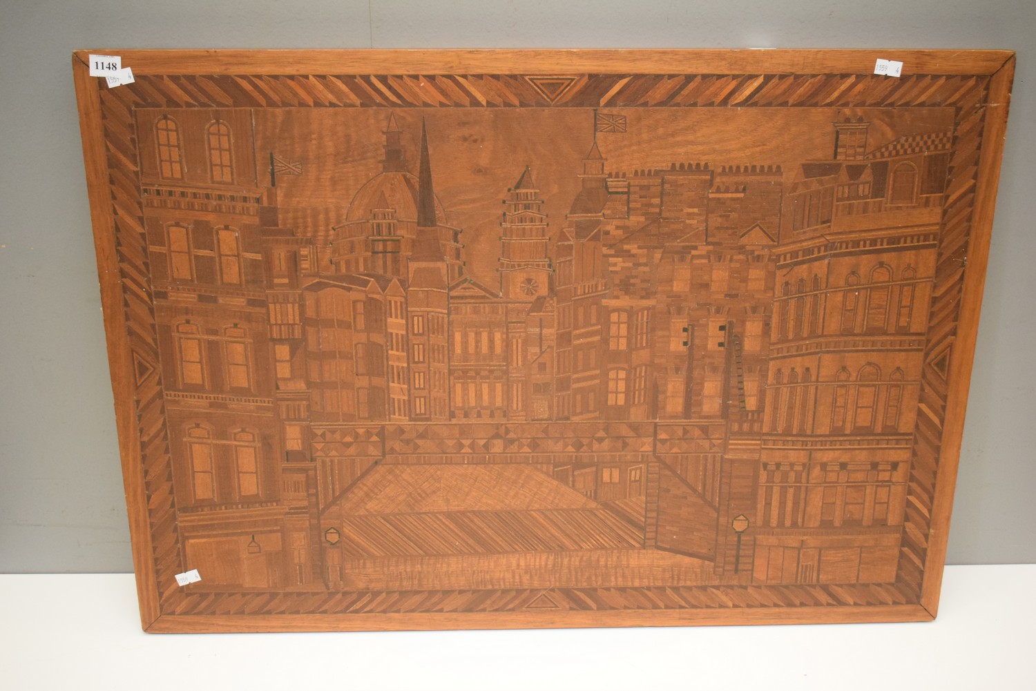 AN ANTIQUE INLAID LONDON TOWN WALL HANGING (54H X 77W CM)