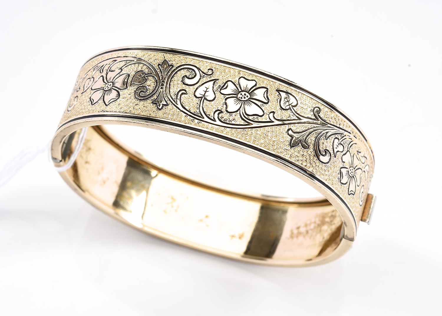 A VINTAGE ENAMEL HINGED BANGLE, GOLD LINED, DIAMETER 60MM