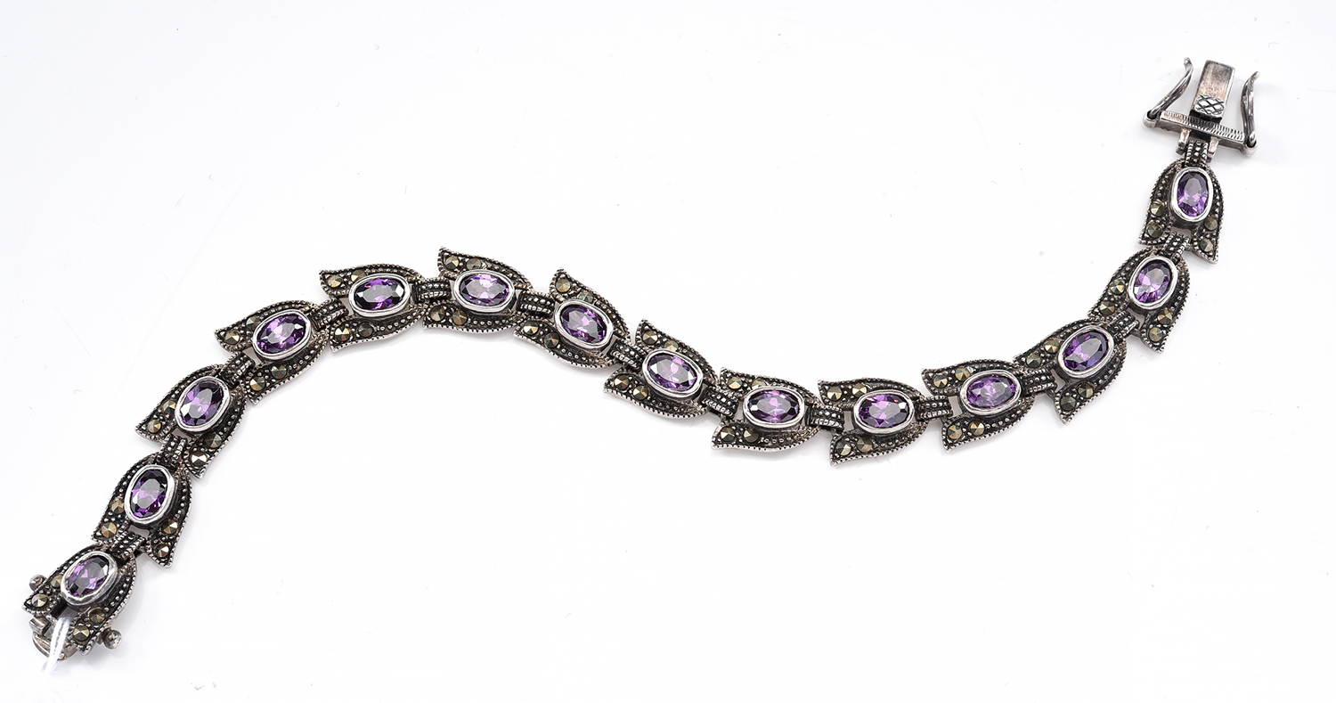 AN AMETHYST AND MARCASITE LINE BRACELET IN STERLING SILVER, TOTAL LENGTH 190MM