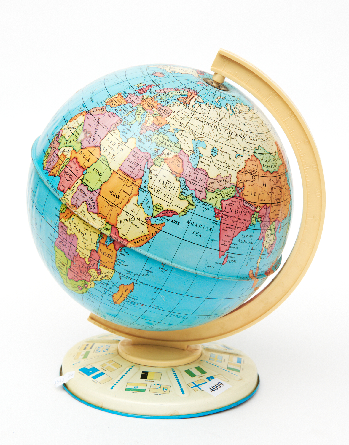 A 1950S TIN CHAD VALLEY WORLD GLOBE WITH FLAGS OF THE WORLD H.28CM, LEONARD JOEL LOCAL DELIVERY SIZE: SMALL