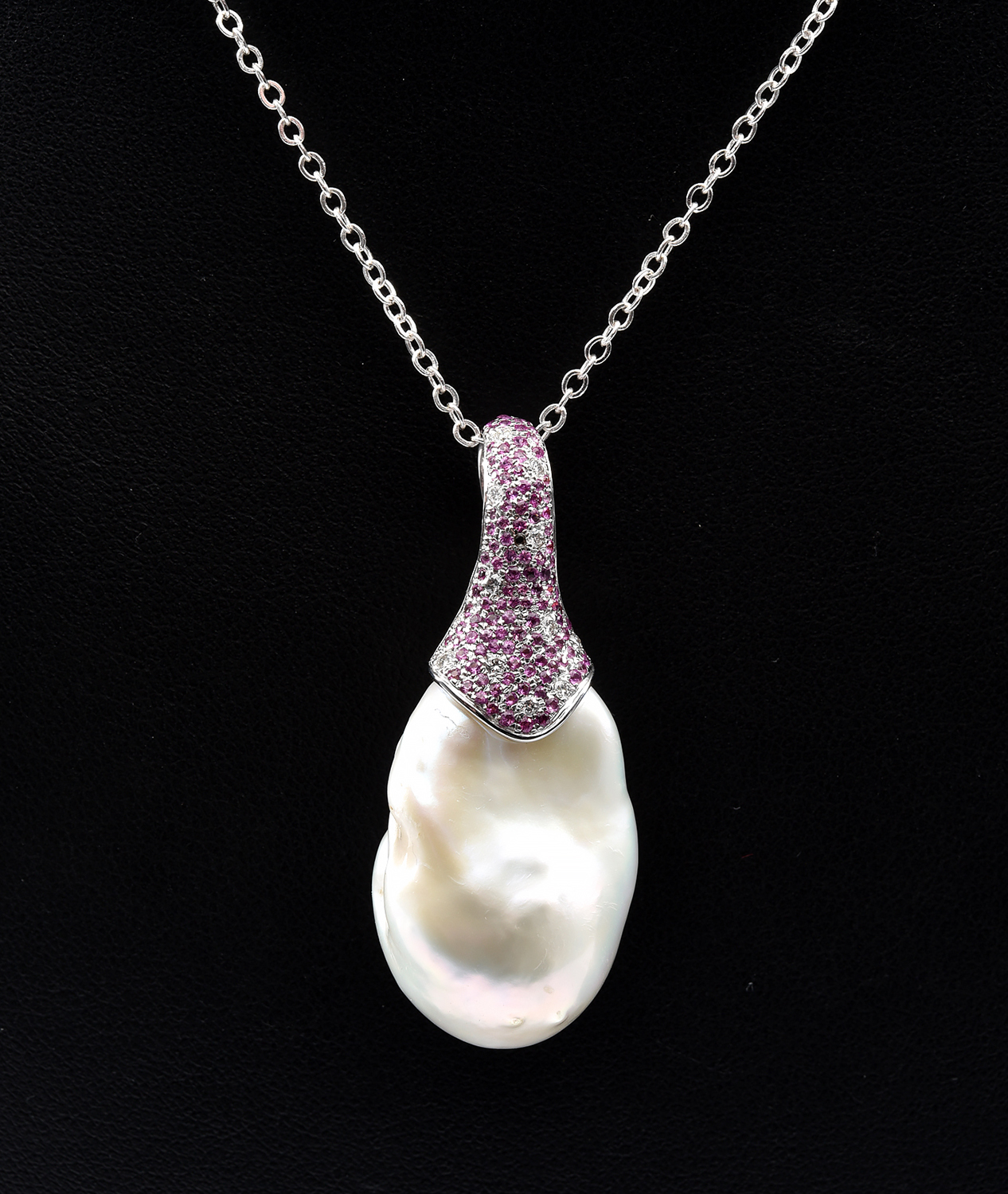 A LARGE BAROQUE PEARL PENDANT SET TO A TAPERING BALE DETAILED WITH PINK SAPPHIRES AND DIAMONDS, IN 18CT WHITE GOLD, PENDANT LENGTH 40MM