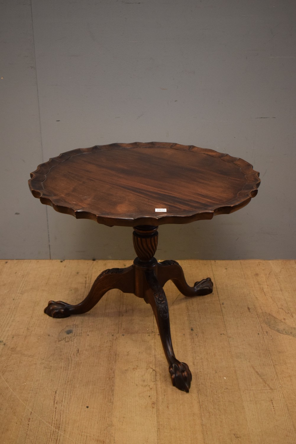 AN ANTIQUE GEORGE III STYLE PIE CRUST FLIP TOP MAHOGANY WINE TABLE WITH LION CLAW FOOT (48H X 61D CM)