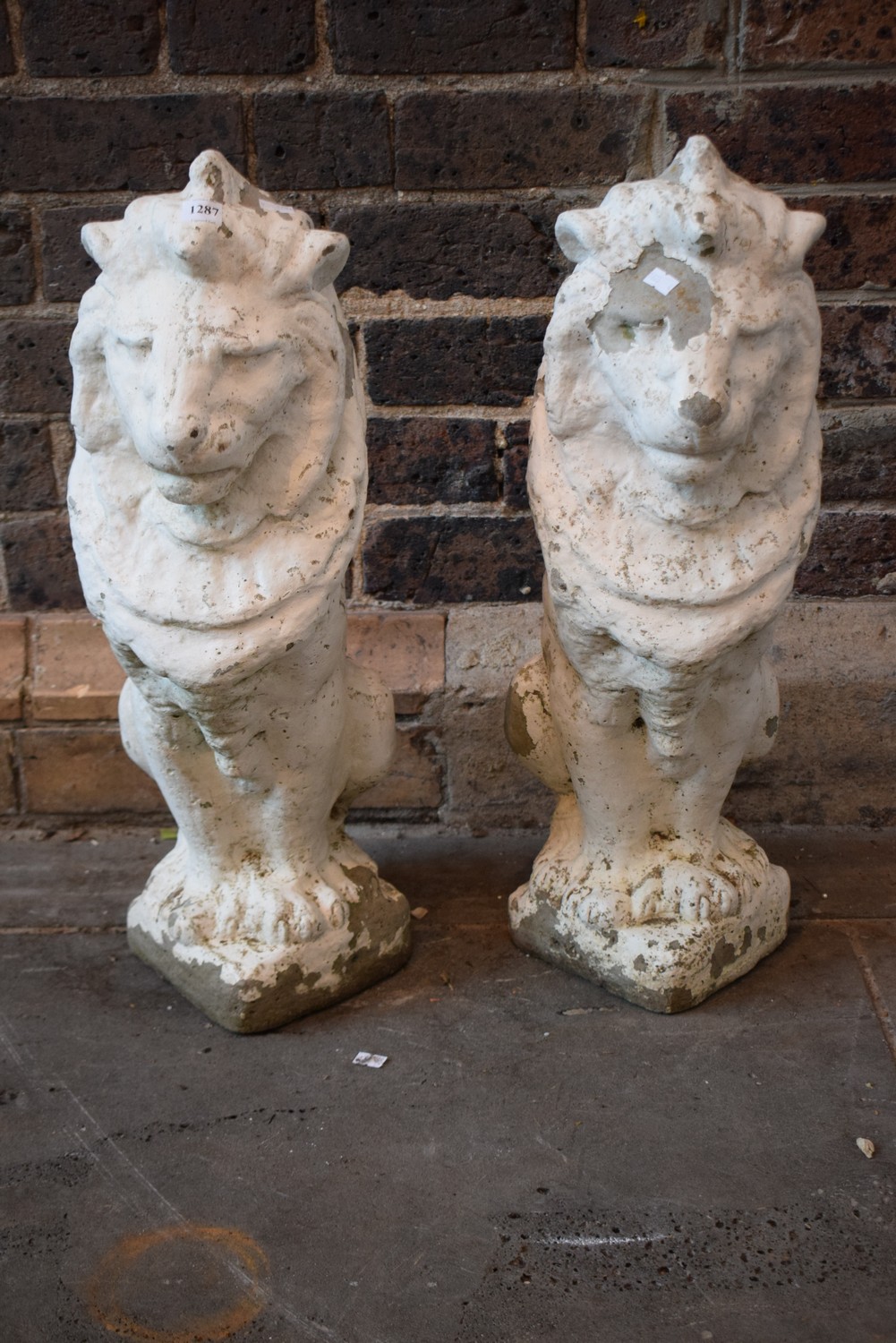 A PAIR OF CONCRETE LIONS (63 H CM) (PLEASE NOTE THIS ITEM MUST BE REMOVED BY CLIENTS OR CARRIERS AT THE CUSTOMERS EXPENSE)