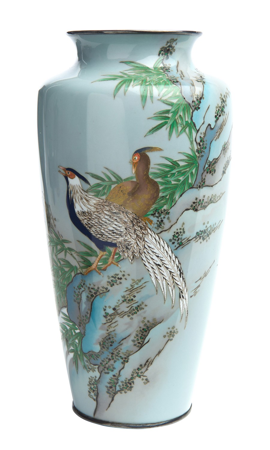 Of baluster form with a pale grey ground, decorated with pheasants by a waterfall, marked Ota Toshiro.