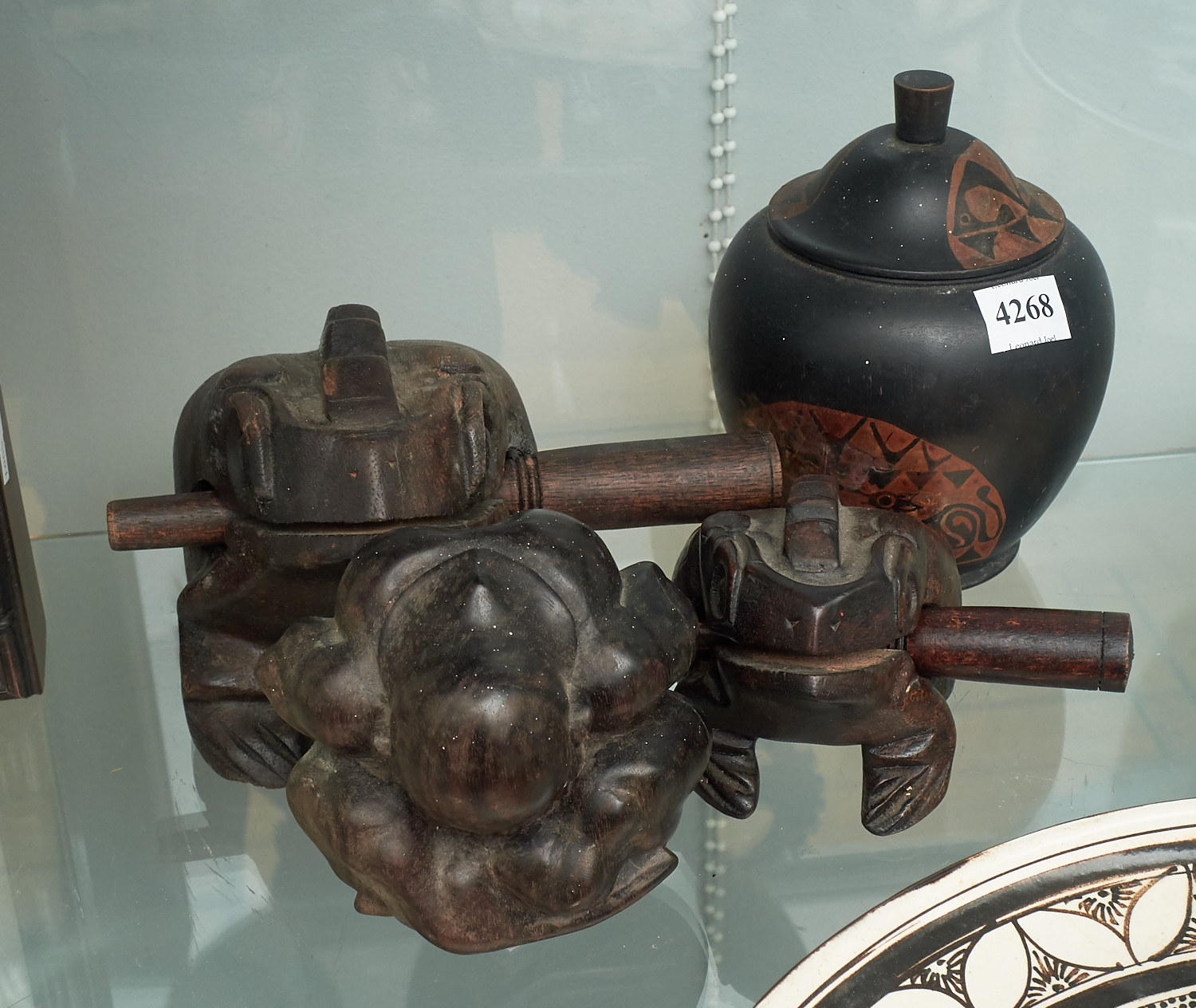 COLLECTION OF WOODEN WARES, INCLUDING TWO THAI FROGS, LIDDED VESSEL AND THINKER FIGURE