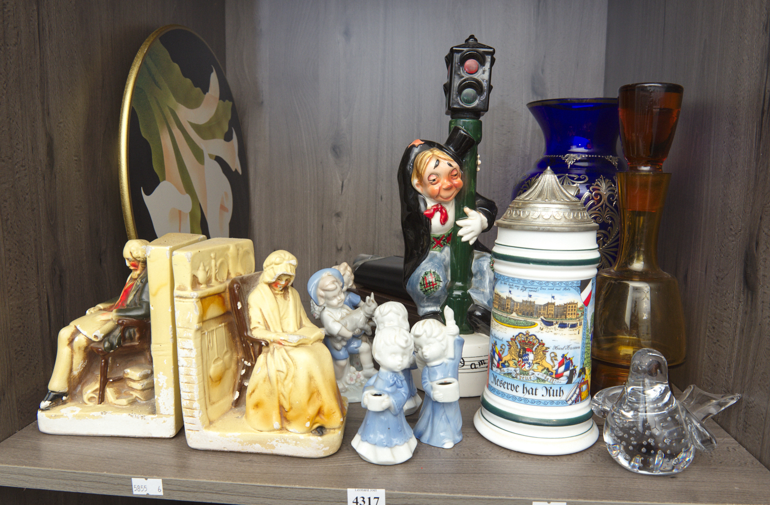 SHELF OF VINTAGE ITEMS INCLUDING COLOURED GLASS, BOOKENDS, ETC