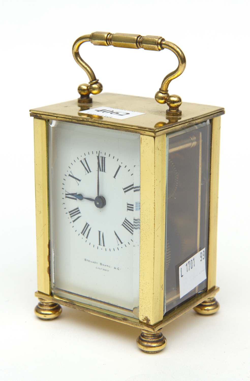 A SMALL BRASS CASED CARRIAGE CLOCK, THE DIAL SIGNED STEWART DAWSON & CO., LONDON, WITH KEY, 14 CM HIGH