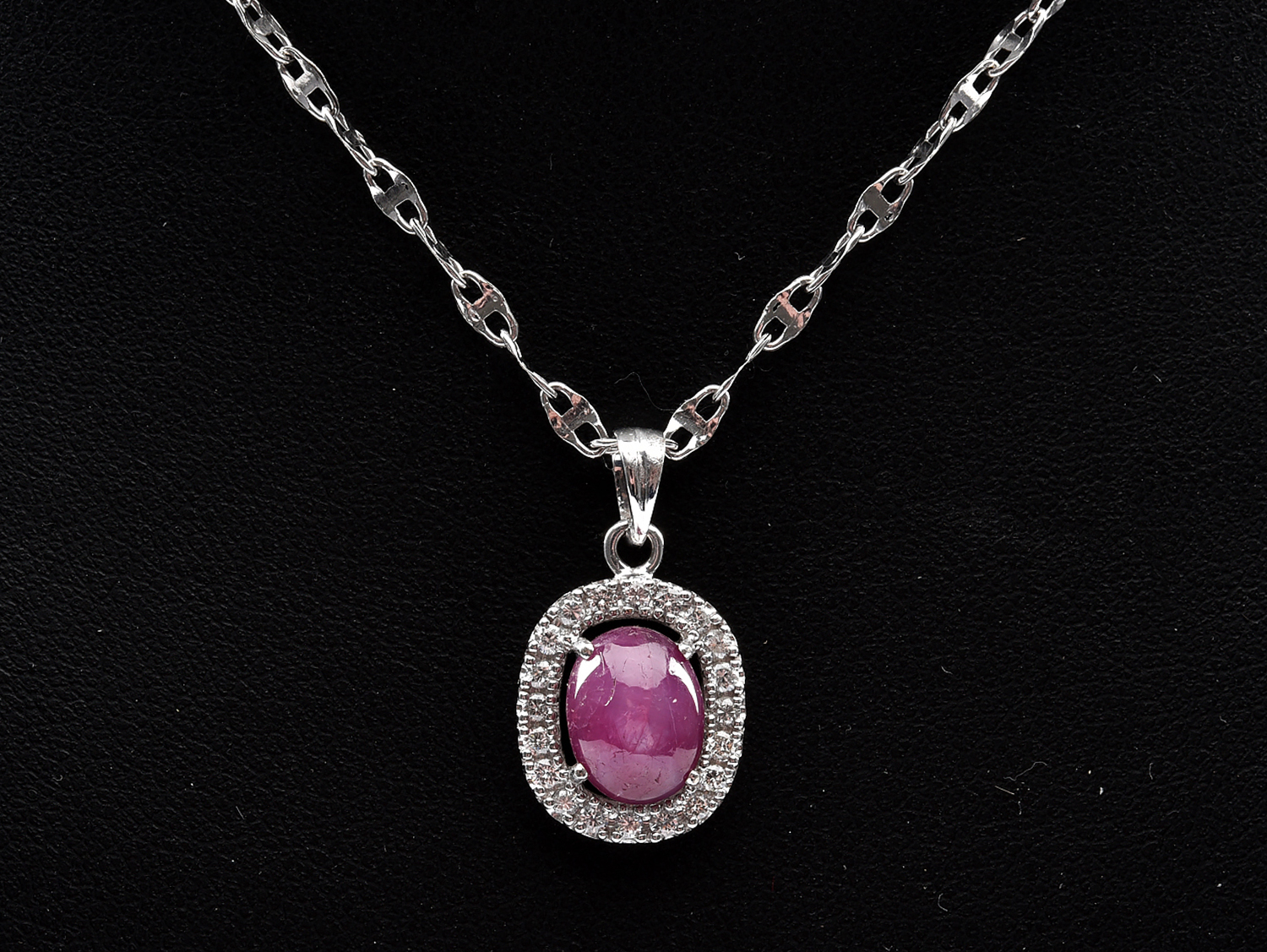 A STAR RUBY OF 2.72CTS AND DIAMOND PENDANT, WITH CHAIN ALL IN 18CT WHITE GOLD