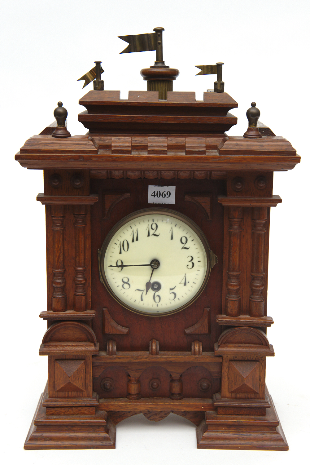 AN EARLY 20TH CENTURY OAK CASED BRACKET CLOCK, THE MOVEMENT SIGNED 'LENZKIRCH', MOUNTED WITH TURNED BRASS FINIALS AND FLAGS, WITH KEY AND PENDULUM, 39 CM HIGH