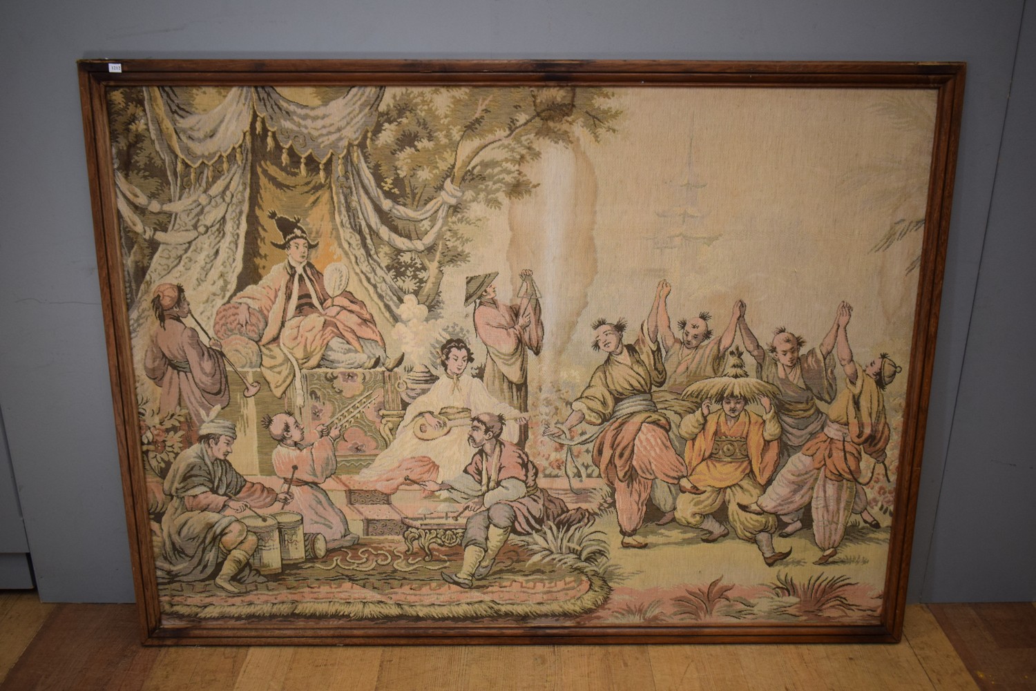 AN ORIENTAL SCENE FRAMED FRENCH TAPESTRY (137.5H X 185W CM) (A/F)