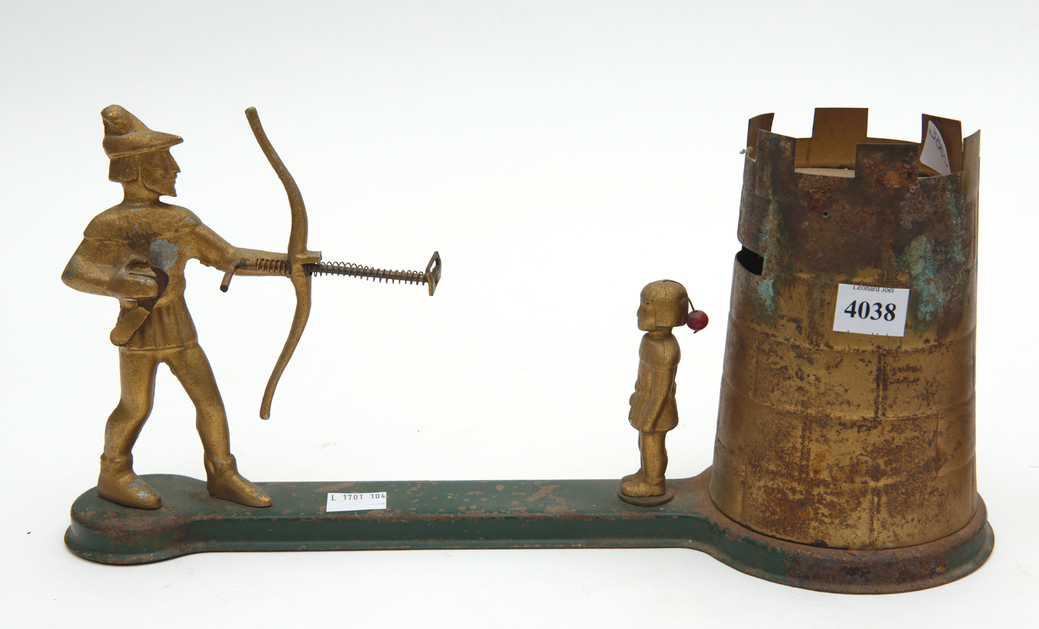 OVERALL LOSSES, ECRETIONS AND AREAS OF OXIDISATION TO THE PAINTWORK; LACKING THE TRAY WHICH IS NORMALLY ATTACHED TO THE FRONT SIDE OF THE HANDLE OF THE BOW, ON WHICH A COIN IS PLACED IN ORDER FOR THE SPRING-LOADED 'ARROW' TO SHOOT IT INTO THE COIN RECEPTICAL
