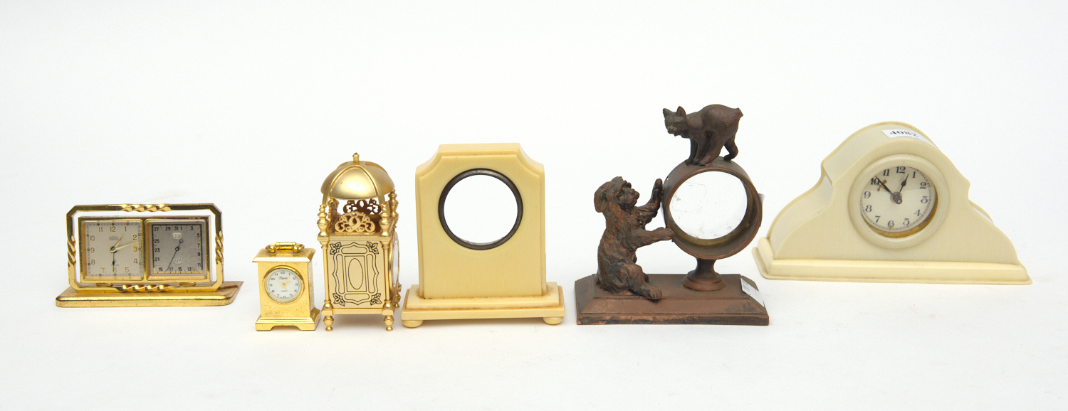 A COLLECTION OF VINTAGE AND NOVELTY CLOCKS AND CLOCK CASES, INCLUDING A BAKELITE CASED ALARM CLOCK, A MINIATURE NOVELTY LANTERN CLOCK (NO MOVEMENT), A MINIATURE QUARTZ MOVEMENT BRACKET CLOCK, A VINTAGE DESK COMBINATION CLOCK/CALENDAR, TOGETHER WITH A BAKELITE CLOCK CASE AND AN ANIMALIA CAST METAL CLOCK CASE