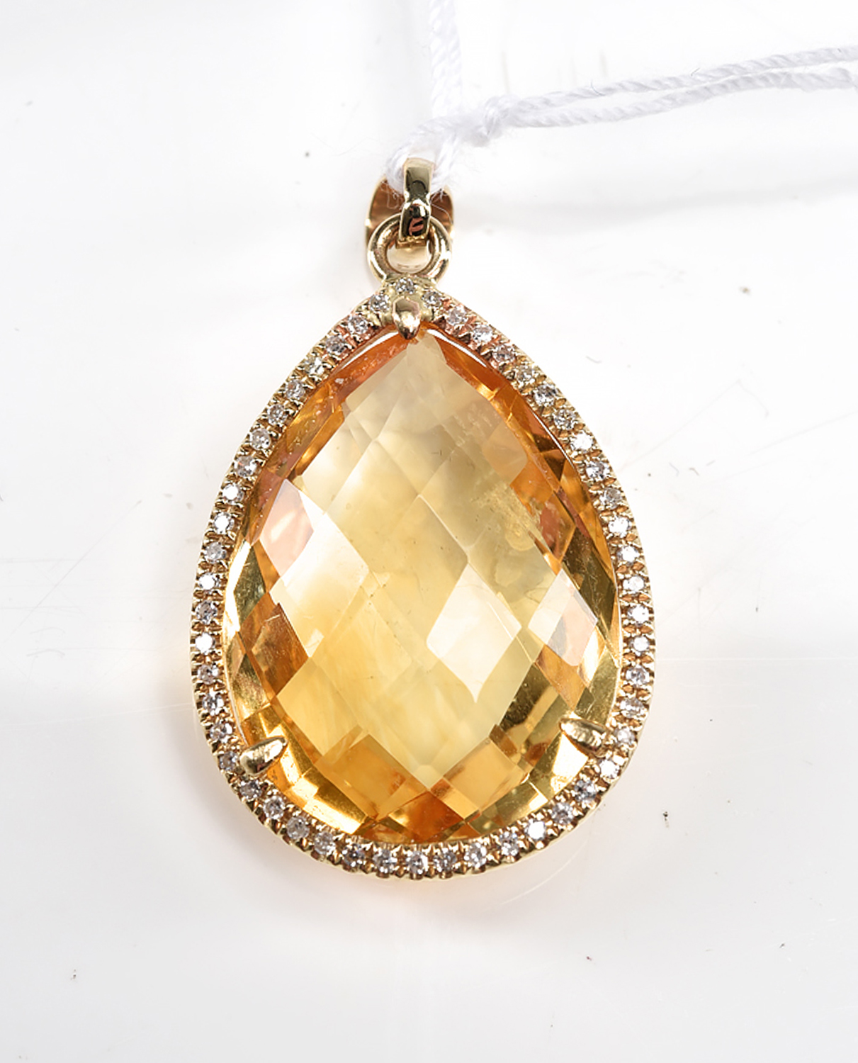 A BRIOLETTE CUT CITRINE AND DIAMOND PENDANT IN 14CT GOLD, THE BALE IN 9CT GOLD, TOTAL LENGTH 30MM, 4GMS