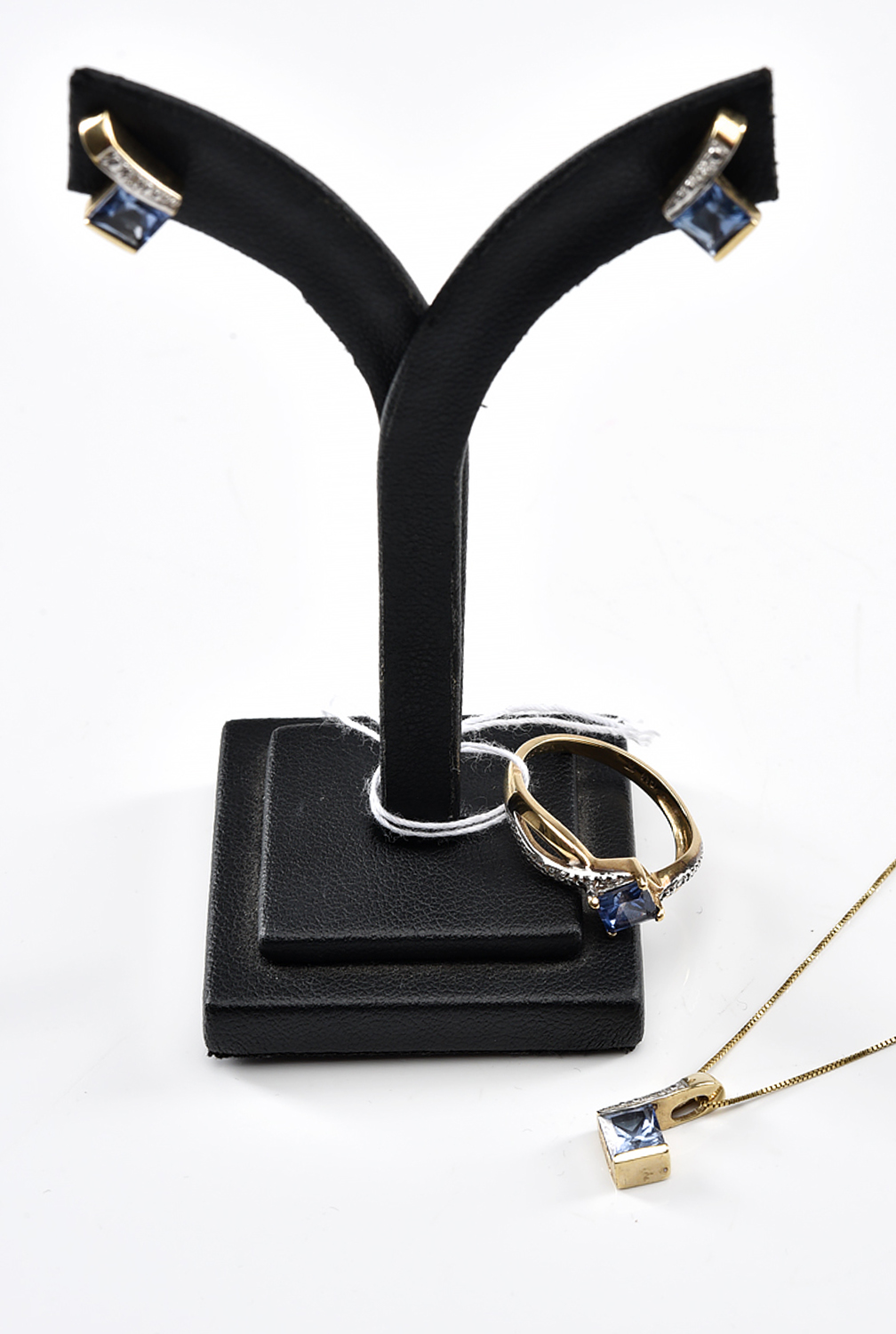 A SYNTHETIC SAPPHIRE AND DIAMOND JEWELLERY SUITE IN 9CT GOLD COMPRISING A RING, A NECKLACE AND A PAIR OF EARRINGS