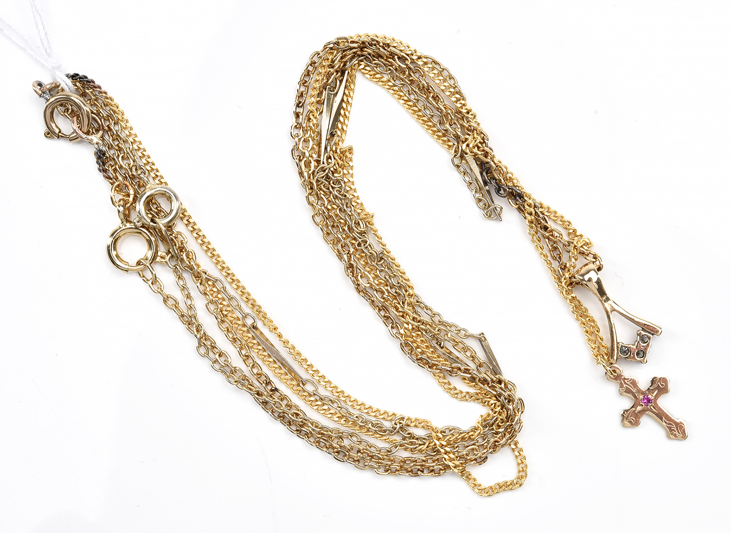 A SMALL CROSS PENDANT IN 9CT GOLD AND A DIAMOND PENDANT IN 14CT GOLD, WITH THREE DISPLAY CHAINS