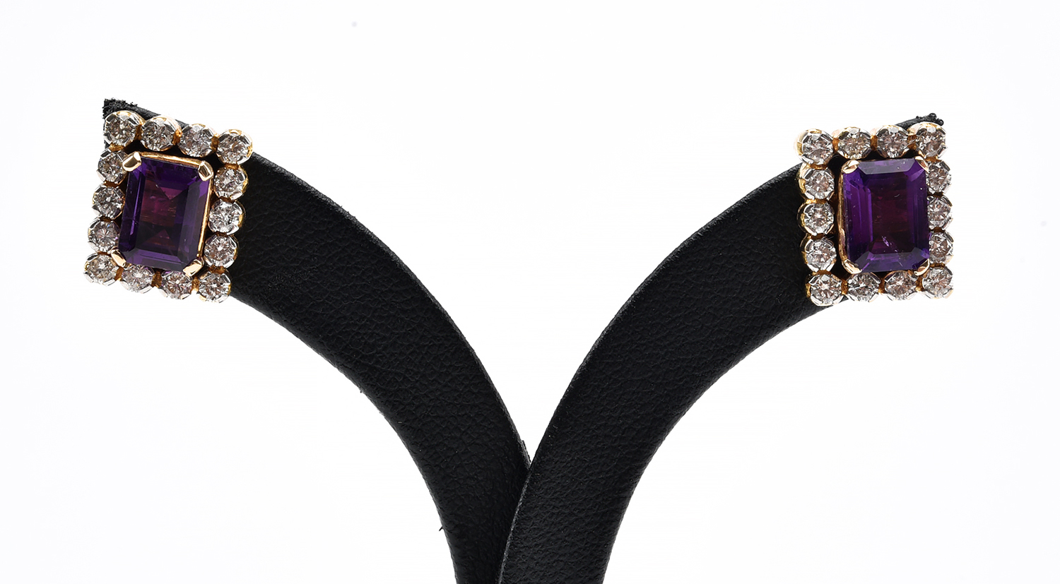 A PAIR OF VINTAGE AMETHYST AND DIAMOND EARRINGS IN 18CT GOLD