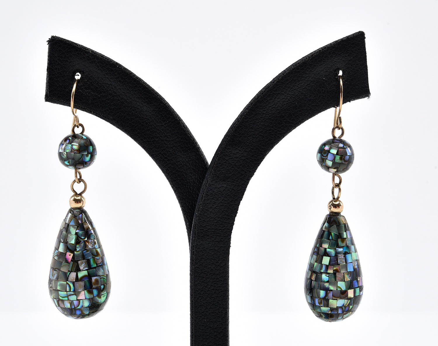 A PAIR OF MOTHER OF PEARL AND PAUA SHELL DROP EARRINGS IN 10CT GOLD