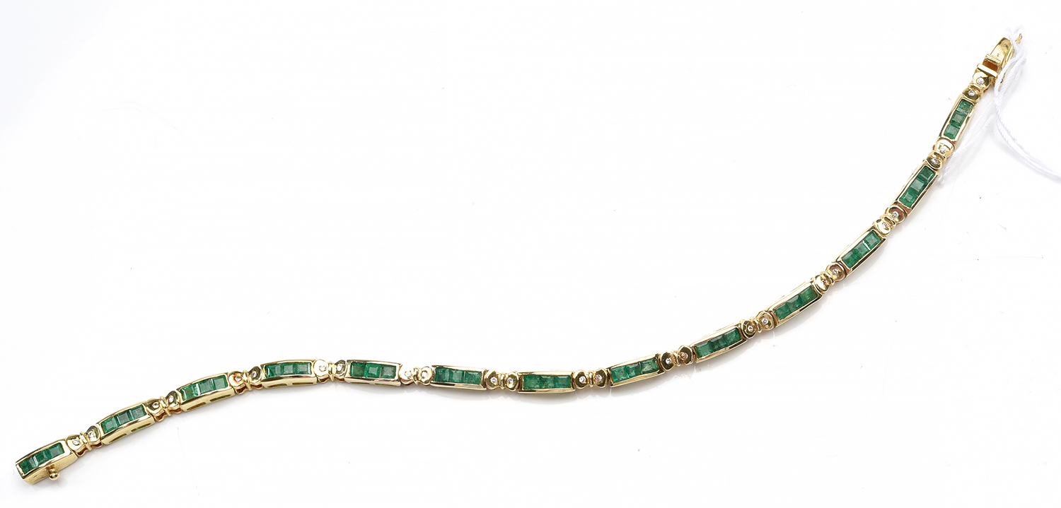 A VINTAGE EMERALD AND DIAMOND BRACELET IN 14CT GOLD, TOTAL LENGTH 190MM, 11.8GMS