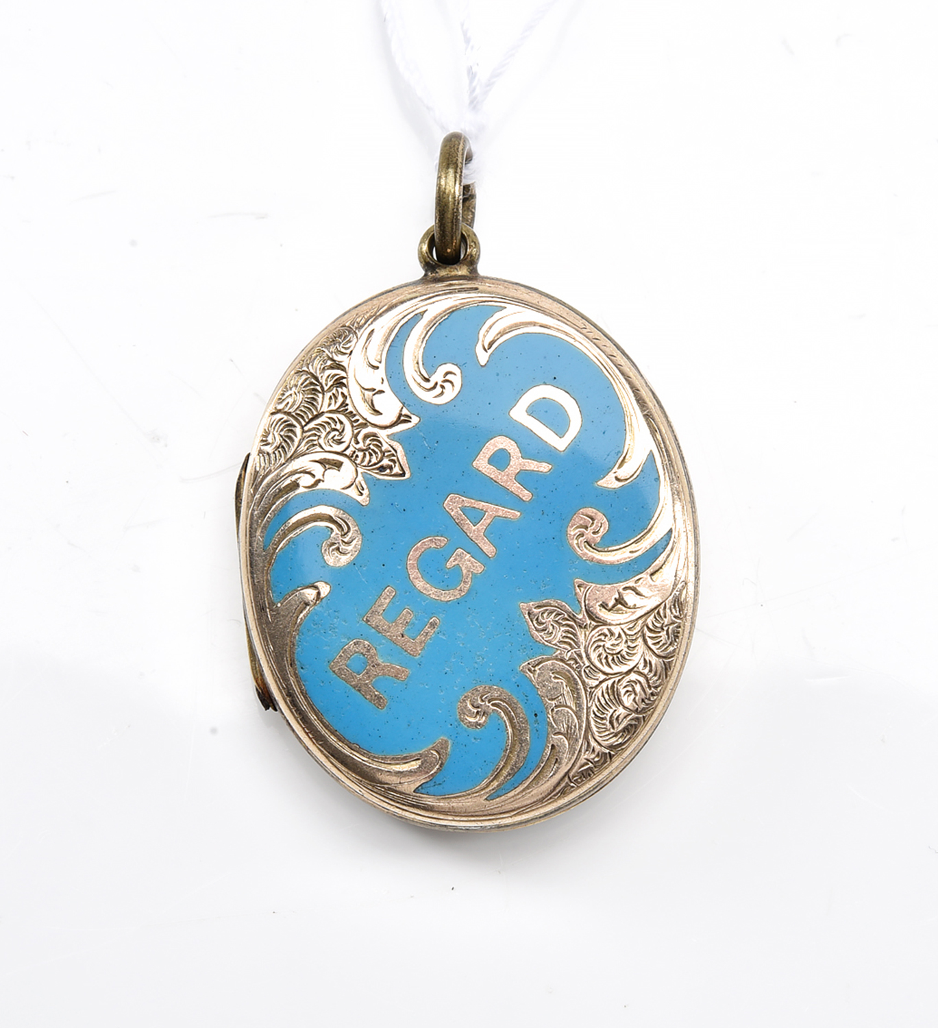 AN ANTIQUE ENAMELLED REGARD LOCKET/PENDANT IN 9CT GOLD, 8.5GMS