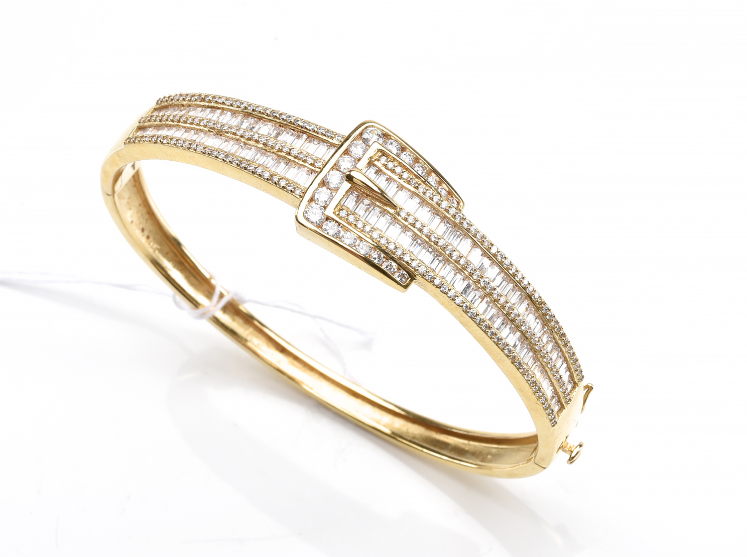 A HINGED BANGLE SET WITH CUBIC ZIRCONIA IN SILVER GILT