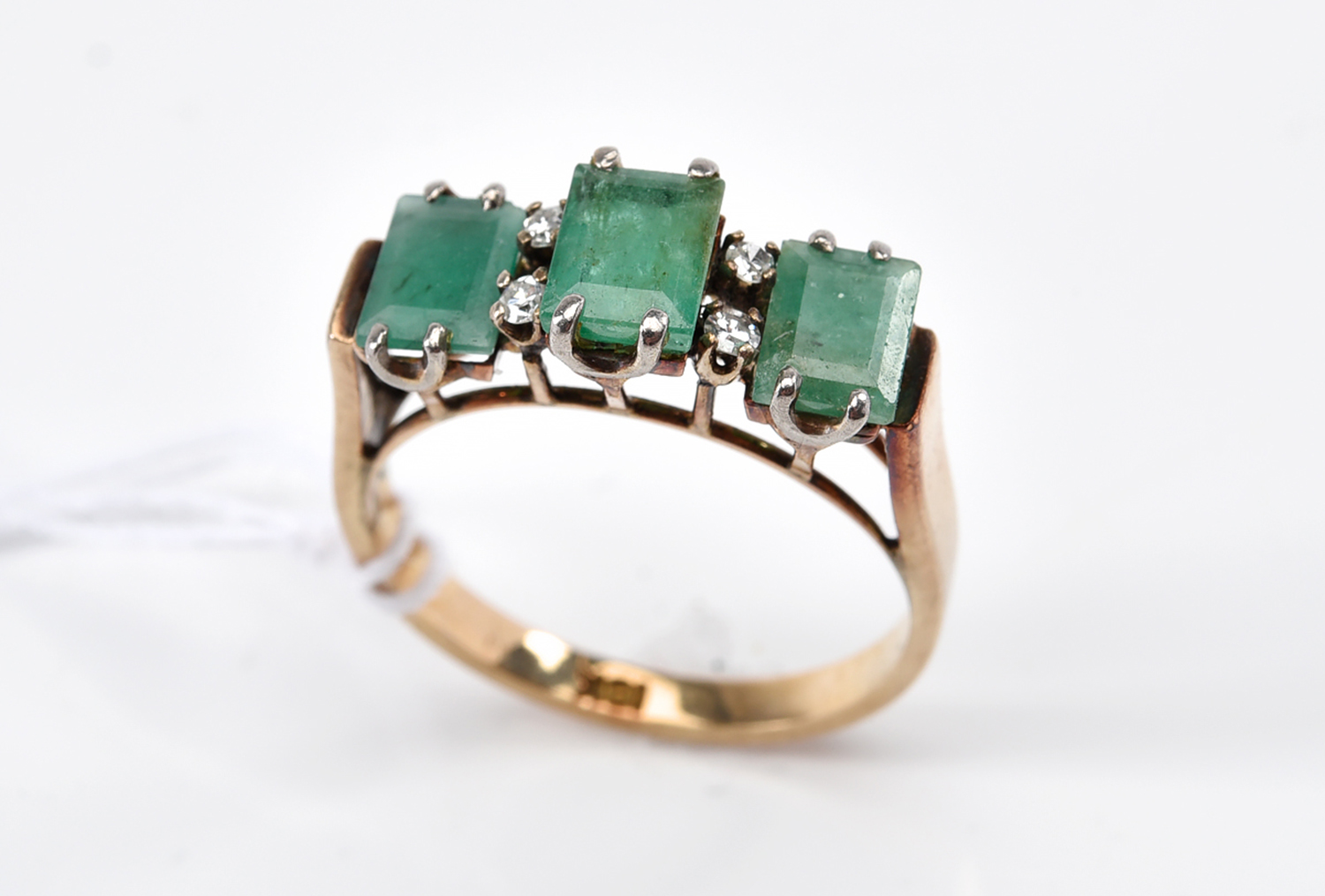 AN EMERALD AND DIAMOND RING IN 18CT GOLD, SIZE L-M, 2.8GMS