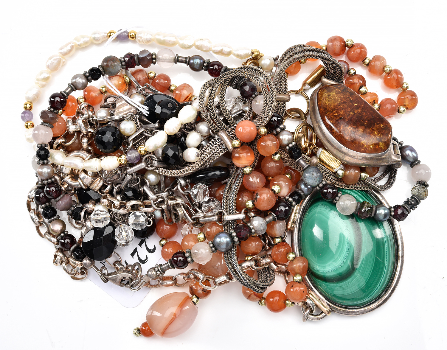 A COLLECTION OF SILVER JEWELLERY INCLUDING MALACHITE, AMBER, ONYX, AGATE, GARNET, PEARLS