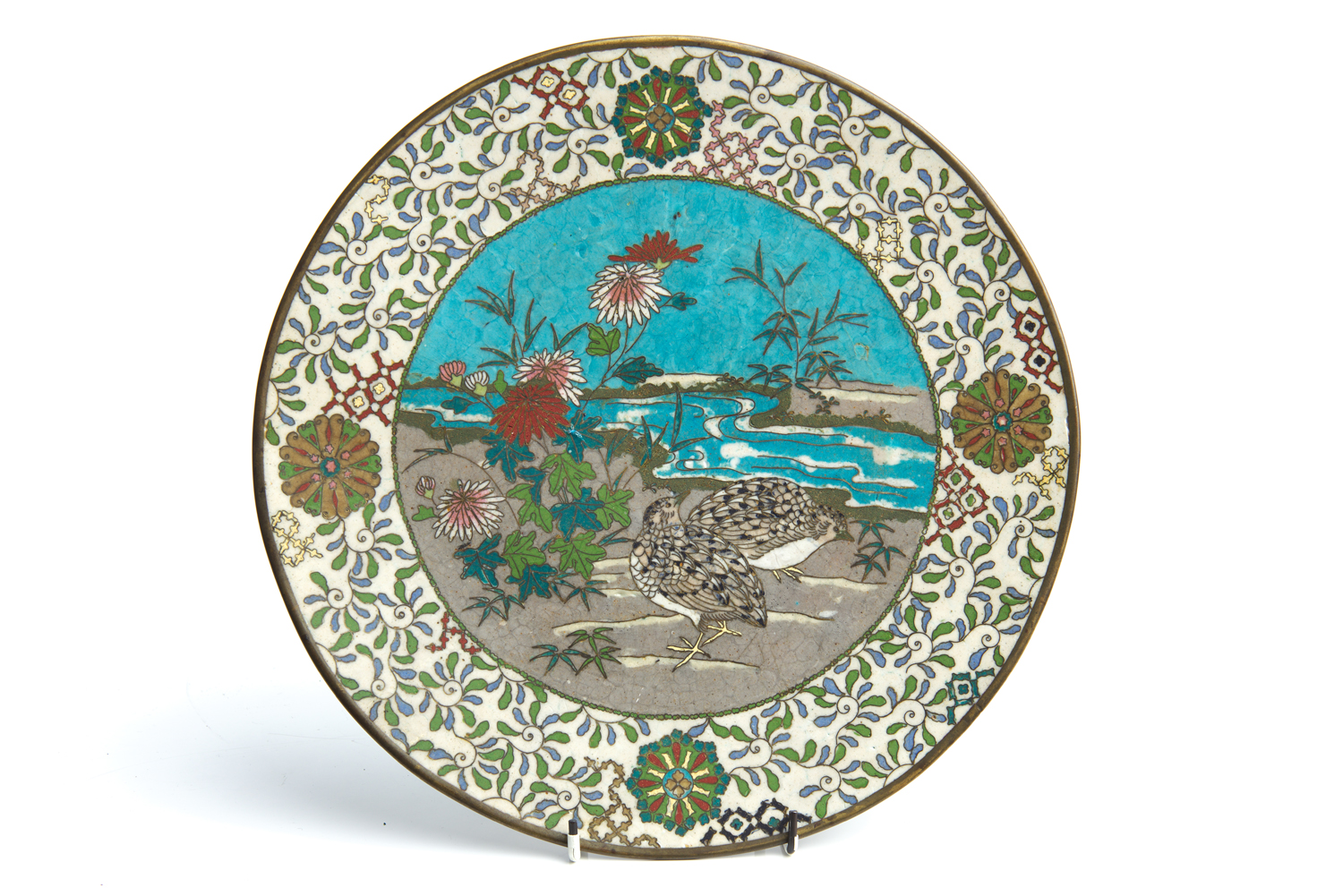 Decorated with a central roundel of quails with flowers, surrounded by a scrolling flower and shippo border.