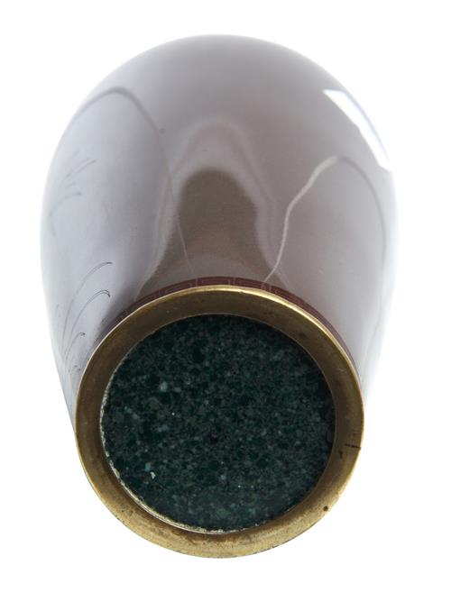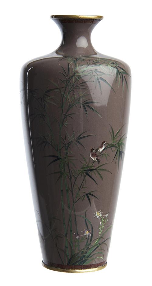 Of baluster form, decorated with sparrows and bamboo against a mauve/grey ground.