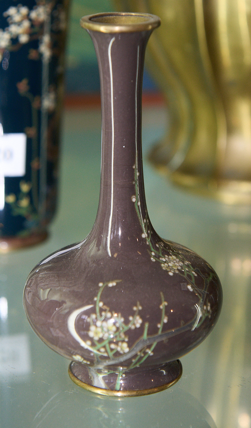 Of globular form with a tall neck, decorated with prunus against a mauve/grey ground. Signed to base.