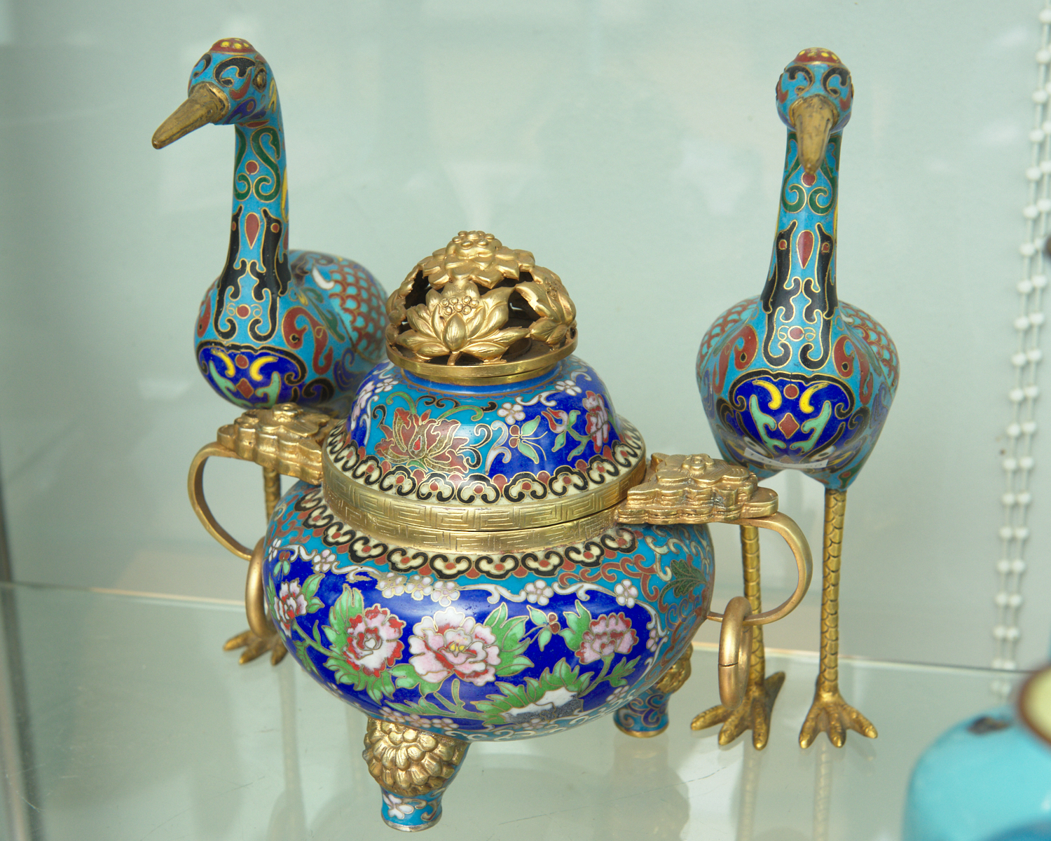 A CHINESE CLOISONNE CENSER TOGETHER WITH A PAIR OF CRANES, 20TH CENTURY. THE CRANES 19CM HIGH, 12CM WIDE.