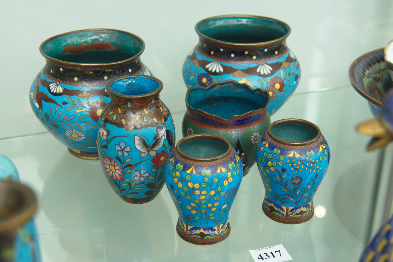 A COLLECTION OF SIX JAPANESE CLOISONNE VASES, MEIJI PERIOD. THE LARGEST VASES 19.5CM HIGH, 10.5CM DIAMETER