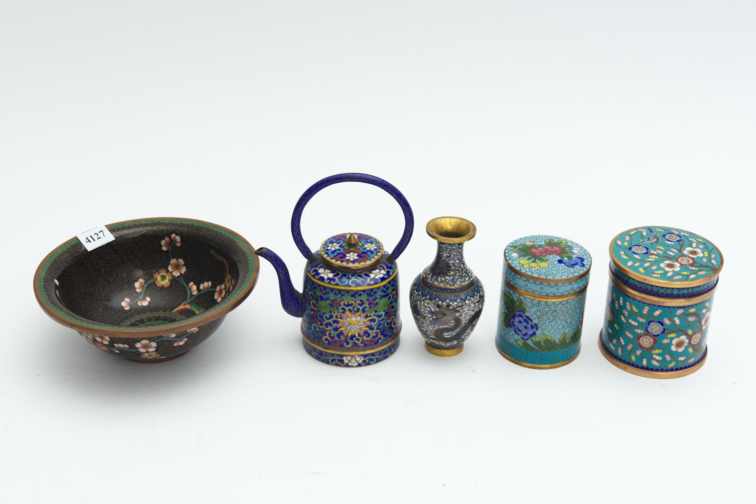 A GROUP OF CHINESE CLOISONNE PIECES, COMPRISING TEAPOT, BOWL, TWO BOXES AND A VASE. THE TEAPOT 14CM HIGH, 12CM WIDE, LEONARD JOEL DELIVERY SIZE: SMALL