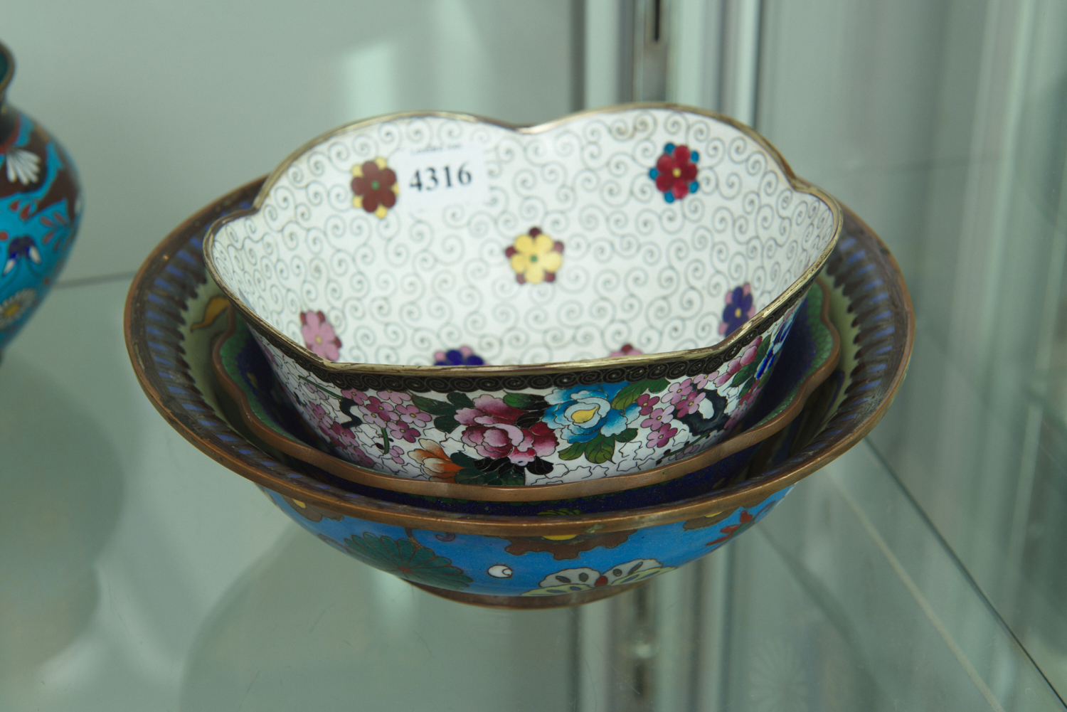 THREE CLOISONNE BOWLS, EACH WITH FLORAL MOTIFS, LATE 19TH CENTURY. THE LARGEST BOWL 6.5CM HIGH, 19.5CM DIAMETER
