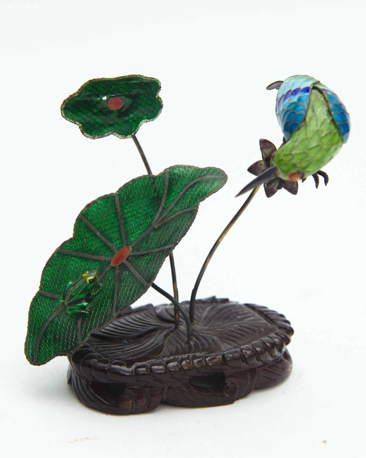 A CHINESE PLIQUE AU JOUR AND CLOISONNE MODEL OF A KINGFISHER ON A LOTUS LEAF, 20TH CENTURY. 12CM HIGH, 11CM WIDE, LEONARD JOEL DELIVERY SIZE: SMALL