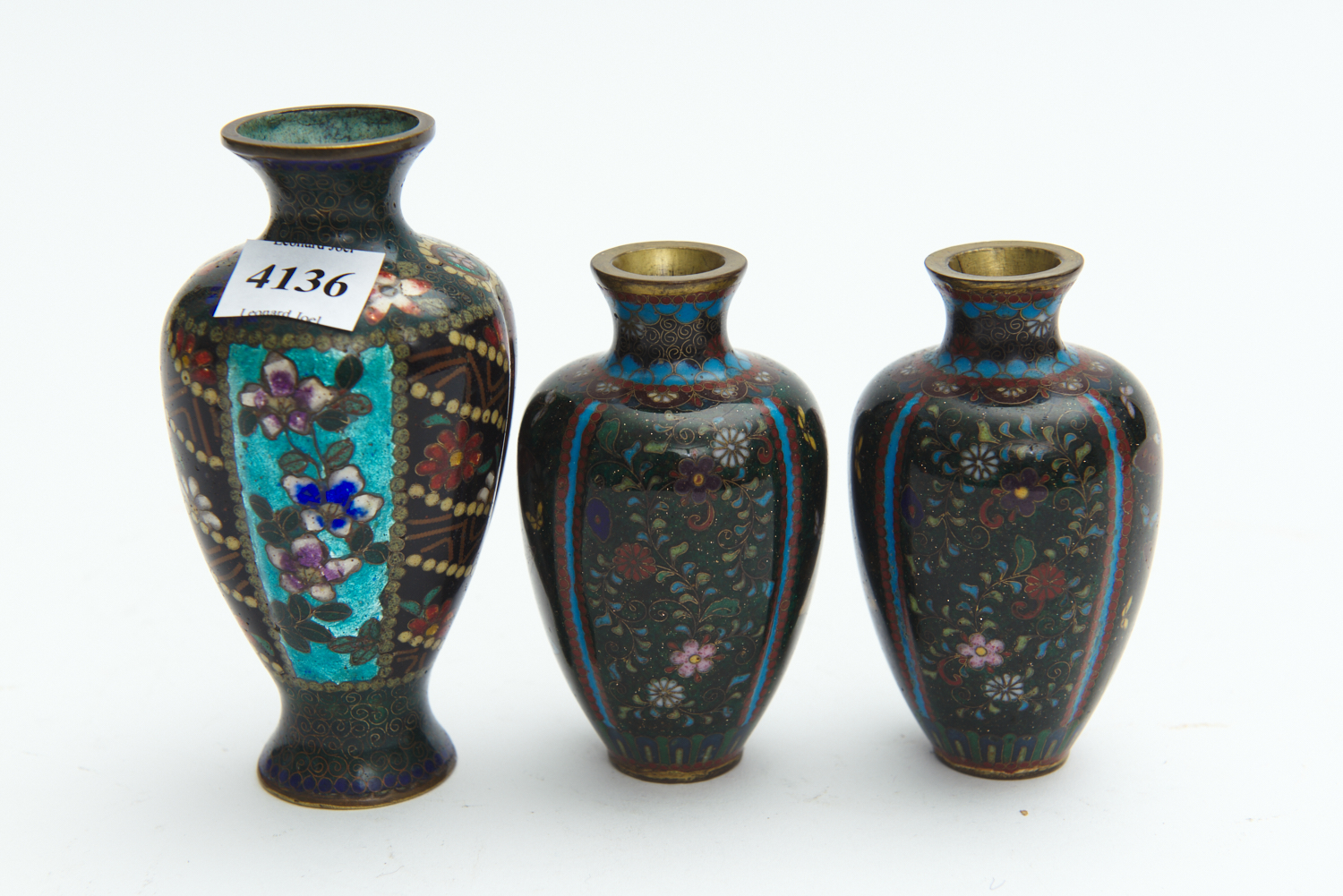 THREE JAPANESE CLOISONNE VASES, MEIJI PERIOD. THE LARGEST 12CM HIGH, 6CM WIDE, LEONARD JOEL DELIVERY SIZE: SMALL