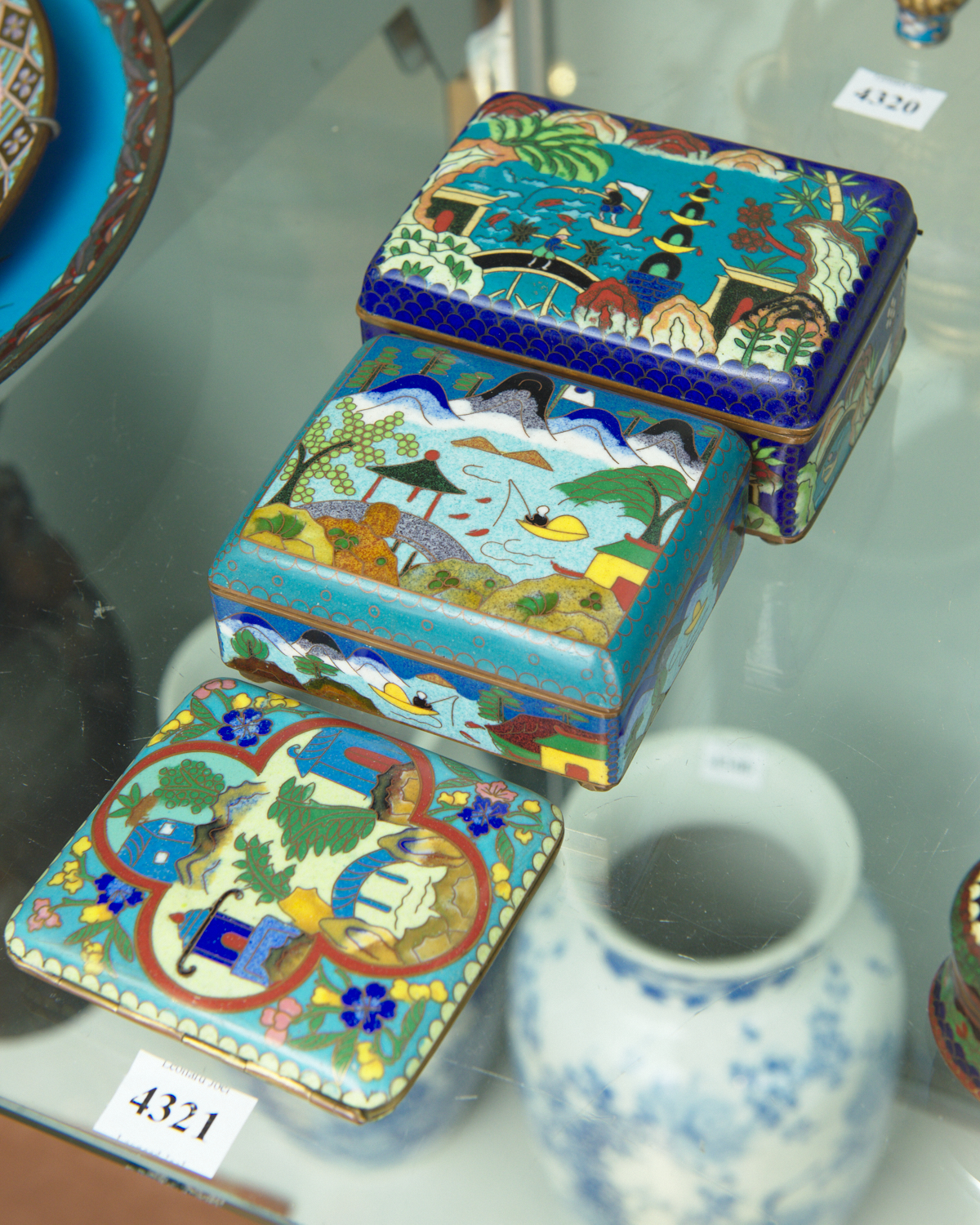 TWO CHINESE CLOISONNE BOXES AND A CIGARETTE CASE, CIRCA 1920S. THE LARGEST BOX 5CM HIGH, 11CM WIDE.