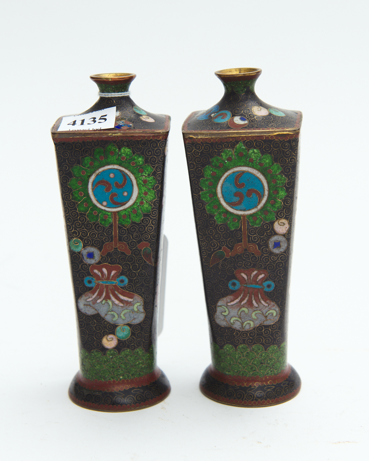 A PAIR OF JAPANESE CLOISONNE VASES, MEIJI PERIOD. 15.5CM HIGH, 7CM DIAMETER, LEONARD JOEL DELIVERY SIZE: SMALL