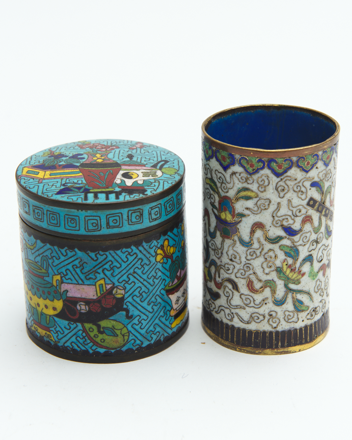 A CHINESE CLOISONNE BRUSH POT H.10CM TOGETHER WITH A CYLINDRICAL BOX, LEONARD JOEL DELIVERY SIZE: SMALL