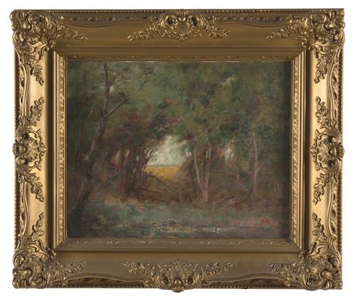 Work in good condition overall. The paint appears to be mostly stable. On the right hand side, there is loss of 2mm, this appears to be caused by the framing nail pushing through the stretcher bar. The painting has been examined under UV light which shows minor areas of repair. The artist's name lower right, appears to have been overlaid and thus fluoresces. Overall size with frame 57 x 65.5cm