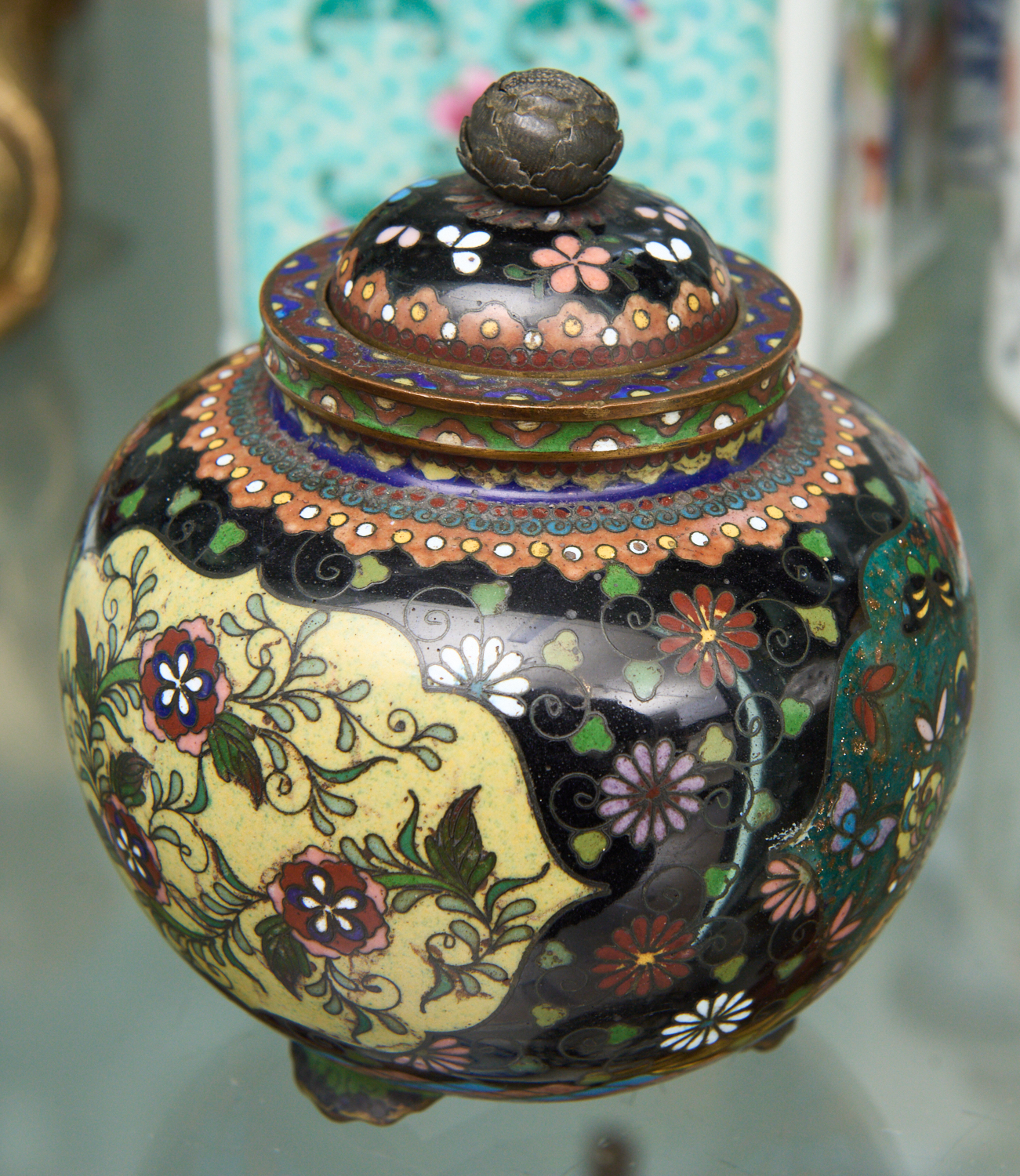 Decorated with shaped reserves, with birds, fowers and butterflies, against a black ground, with scrolling flowers, with a delicate peony form finial to the lid.