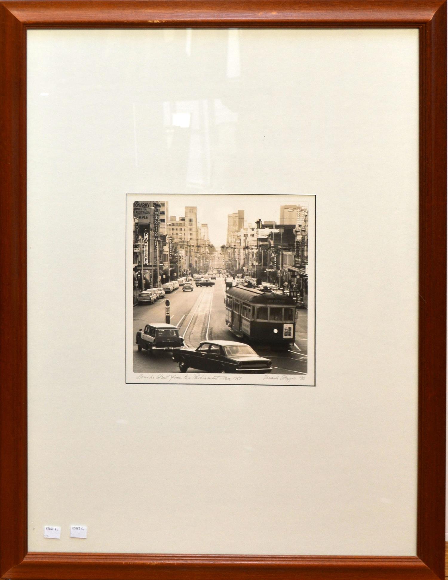 MARK STRIZIC, BOURKE STREET FROM PARLIMENT - TWO 1967, SILVER GELATIN PHOTOGRAPH, PRINTED 1998, 25 X 25CM, FRAME SIZE: 65 X 84CM, CONDITION: VERY GOOD CONDITION, WEAR TO FRAME