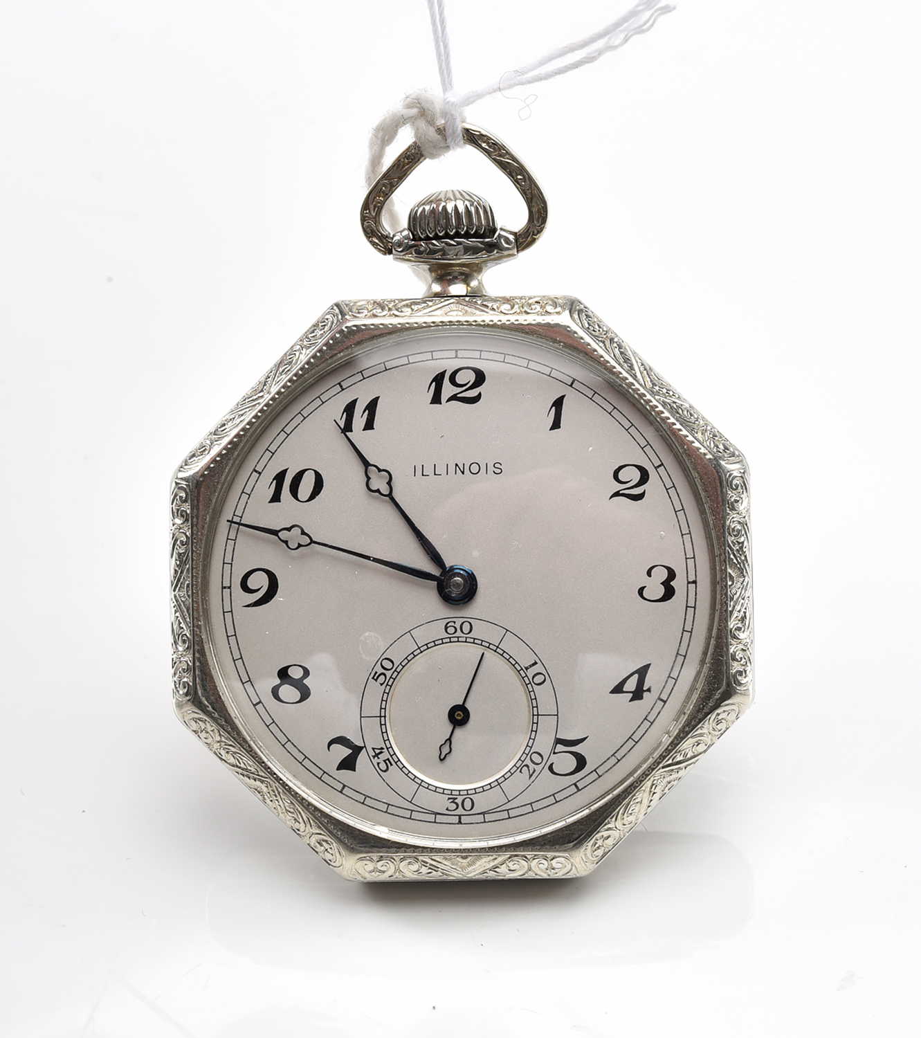 AN OPEN FACED POCKETWATCH BY ILLINOIS IN SILVER OCTAGONAL ENGRAVED CASE, CIRCA 1924