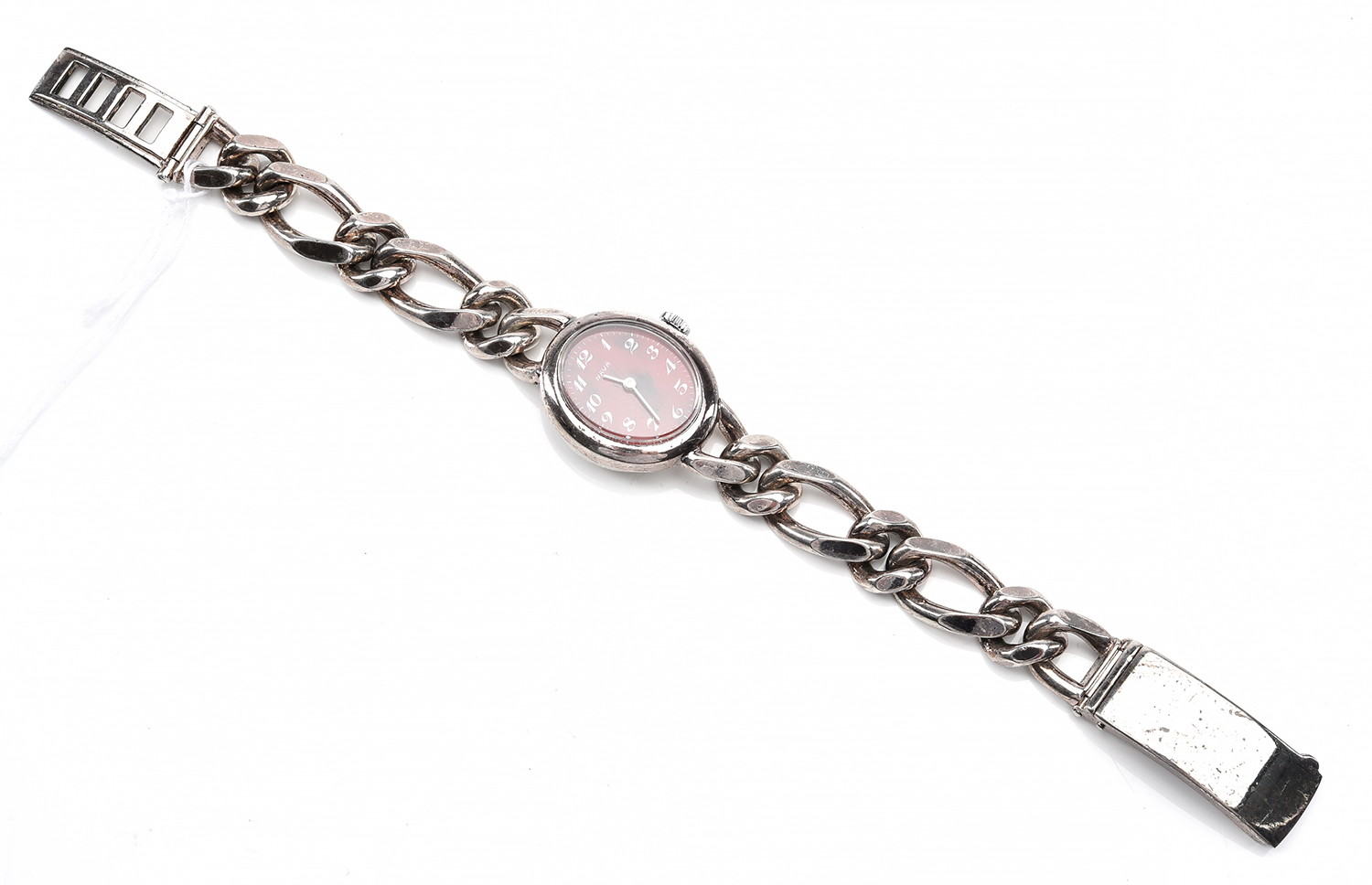 A LADIES NAVA MANUAL WIND WRISTWATCH/BRACELET WATCH TO STERLING SILVER CASE AND BRACELET BANDS (RED DIAL)