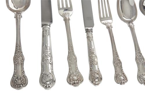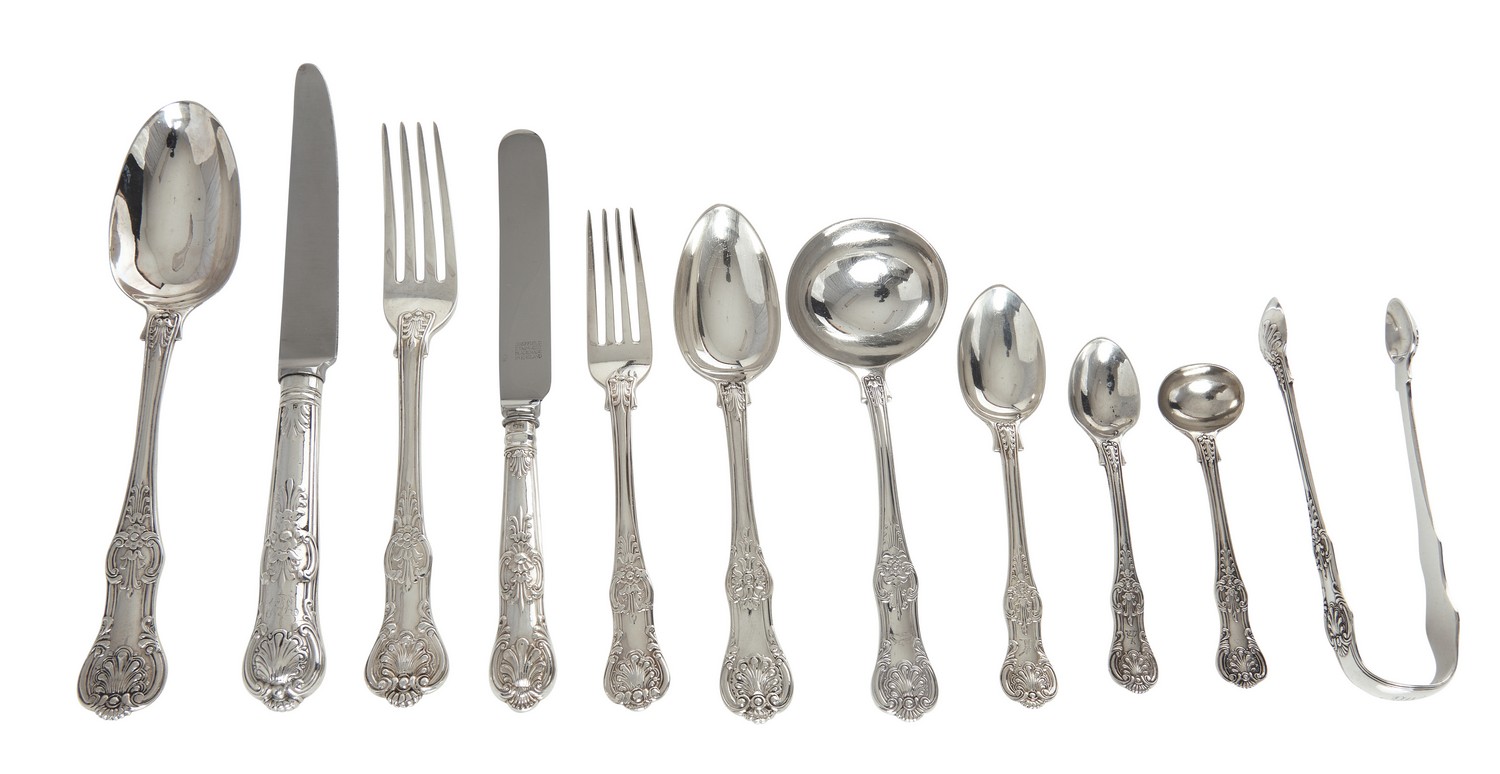 Comprising a cutlery setting for six people, plus a pair of sauce ladles, two salt spoons and a pair of sugar tongs.