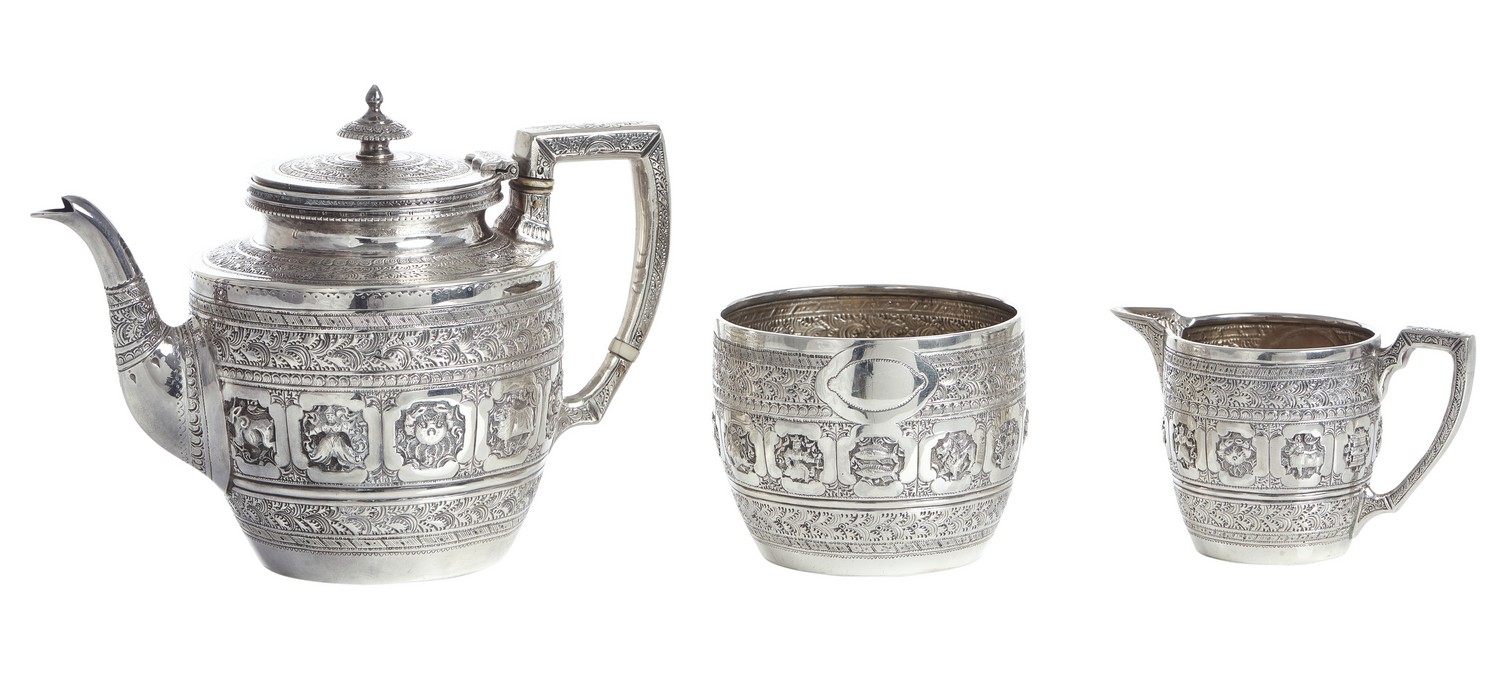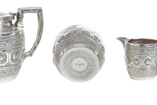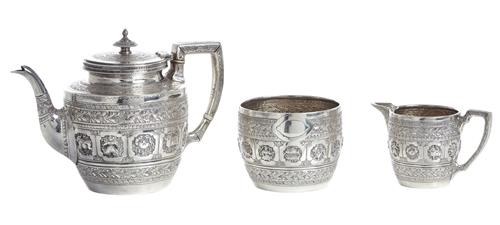 Comprising teapot, creamer and sugar pot. Each piece inspired by Indian taste, and decorated with a band of reserves representing the twelve symbols of the zodiac.