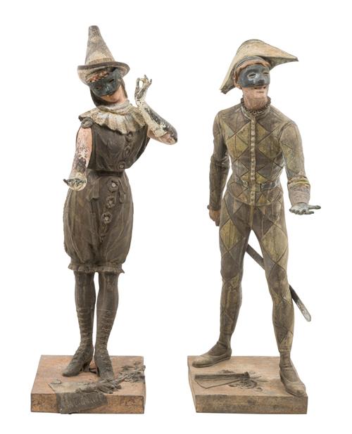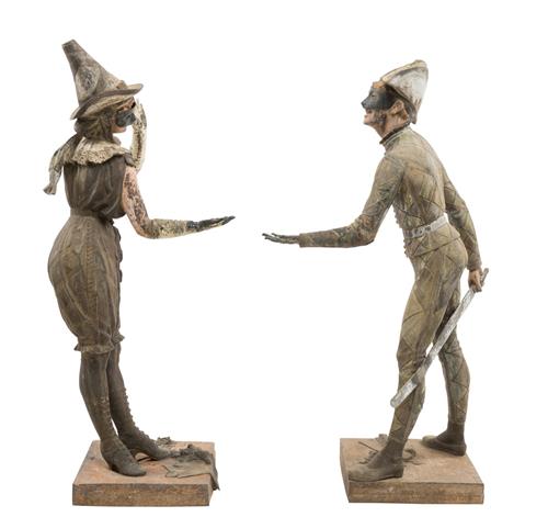 Modelled as a male and female harlequin, each attired in typical harlequin costume, above an integral square base, one signed Waagen.