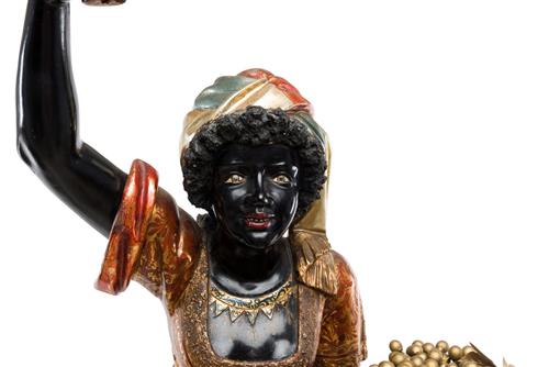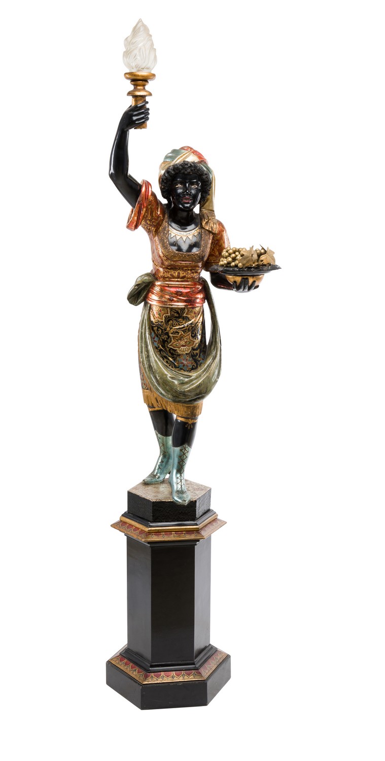 Modelled as a woman holding a lamp aloft with a frosted glass flamiform shade. The whole richly painted and raised on a faceted pedestal.