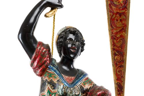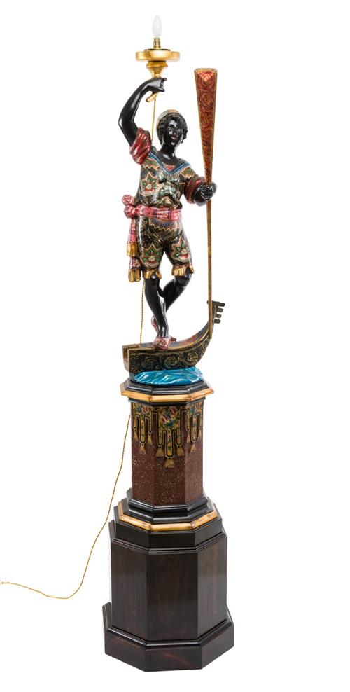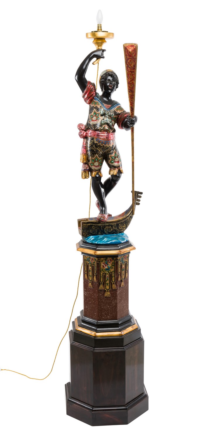 Modelled as a young gondolier, standing on the prow on a gondola, holding a removable oar in one hand, and holding a torch aloft in the opposite hand (the lamp having no shade). The whole richly painted and raised on a faceted pedestal.
